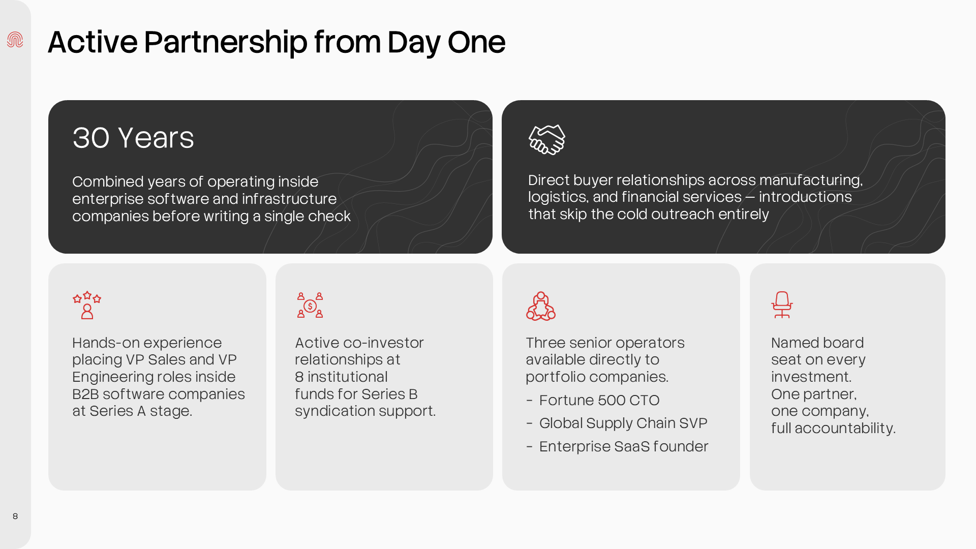 Commitment-based promises: hands-on support, deep networks, operational expertise.