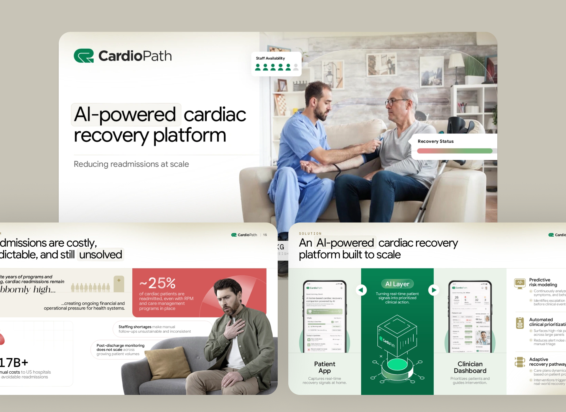Designed a Series A investor deck explaining an AI-powered cardiac recovery platform.